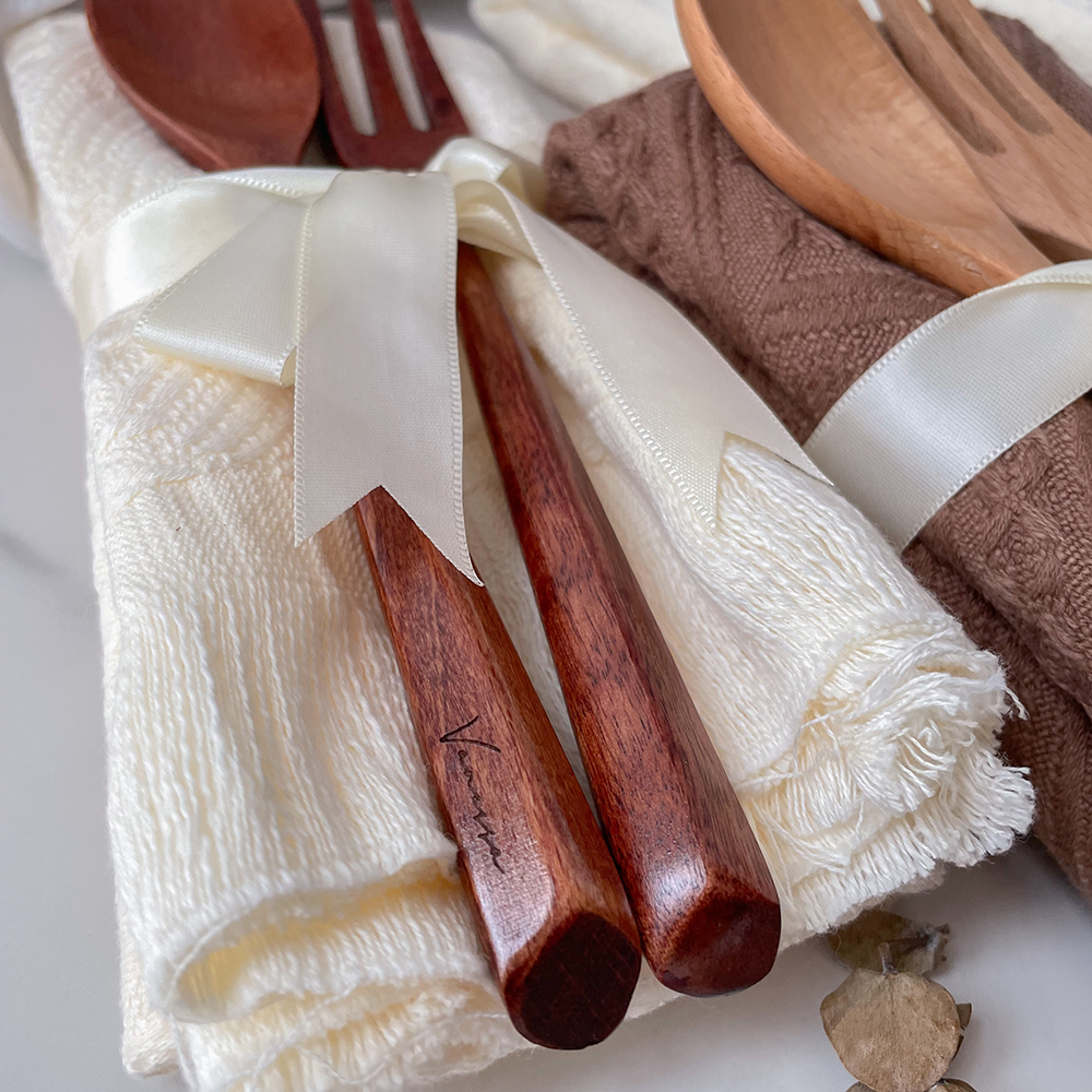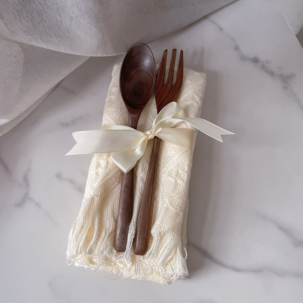 A simple wooden utensils x tea cloth set that is functional and great as wedding favours/door gifts, or perfect as a house-warming gift!